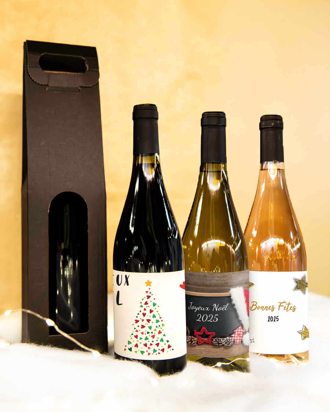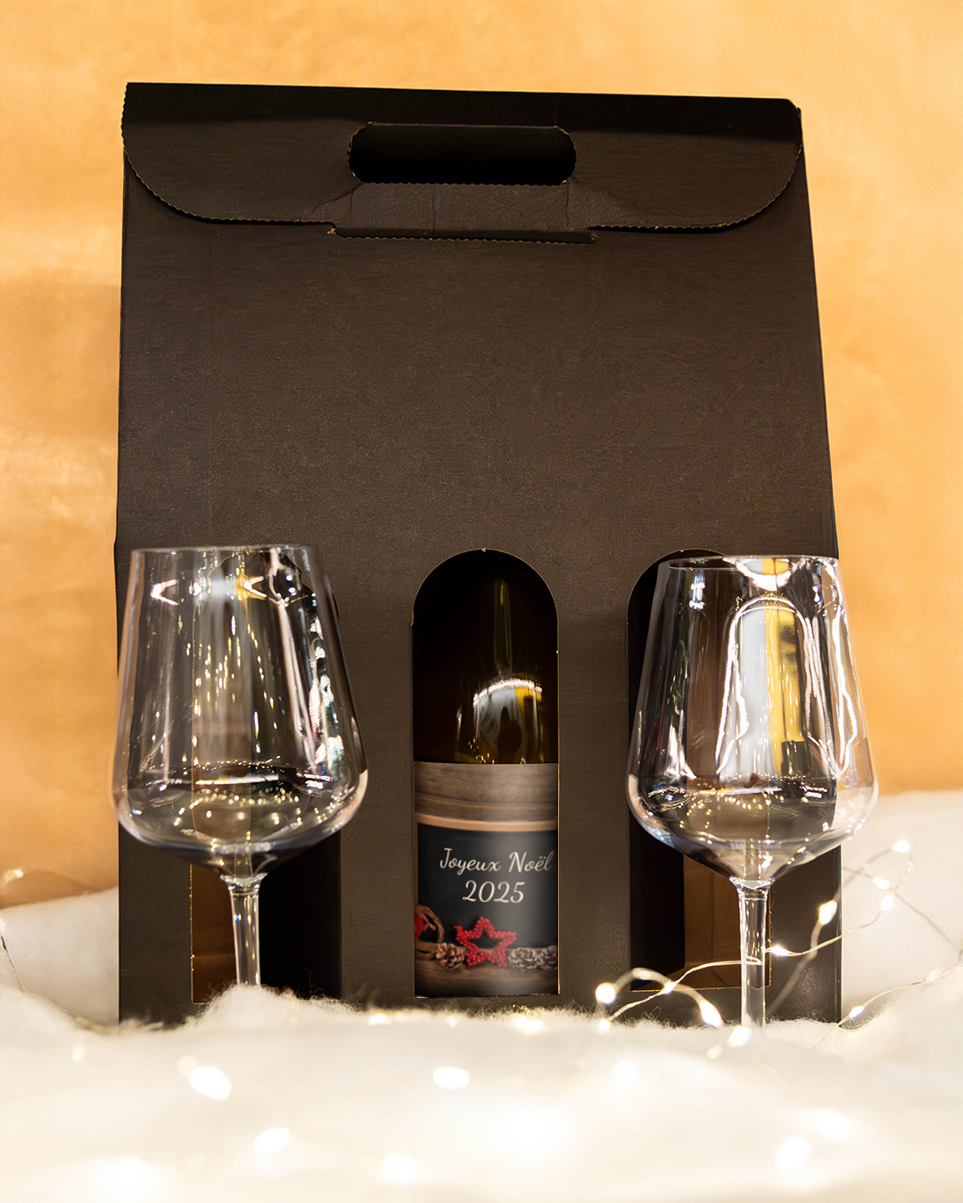 Chaque bouteille est présentée dans une valisette kraft noire sobre et raffinée, parfaitement adaptée à un cadeau de Noël chic et moderne. Un écrin minimaliste qui met en valeur la personnalisation et la qualité du vin.