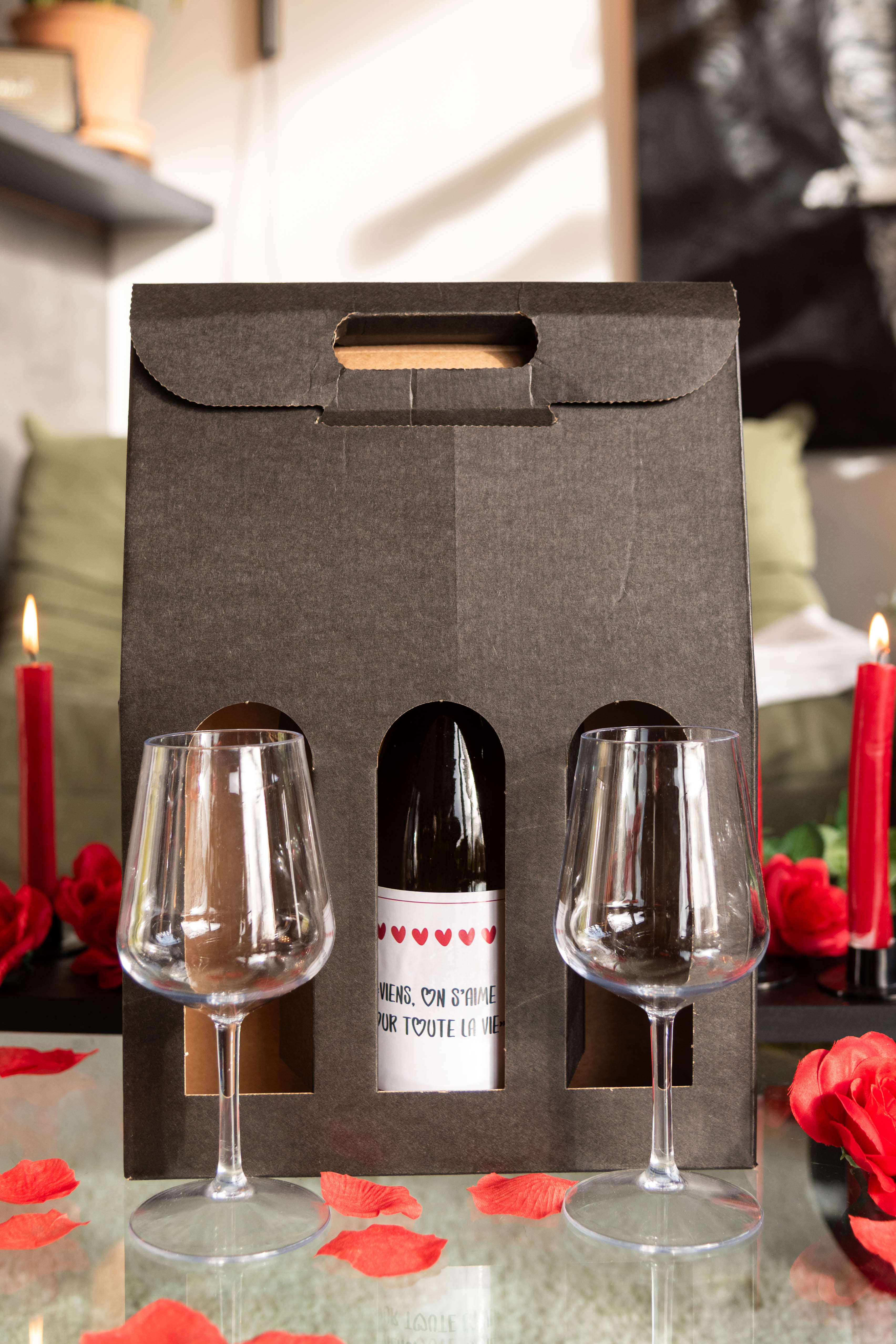 Chaque bouteille est présentée dans une valisette kraft noire sobre et raffinée, un écrin chic et minimaliste, parfait pour surprendre votre moitié et ajouter une touche romantique à votre soirée.